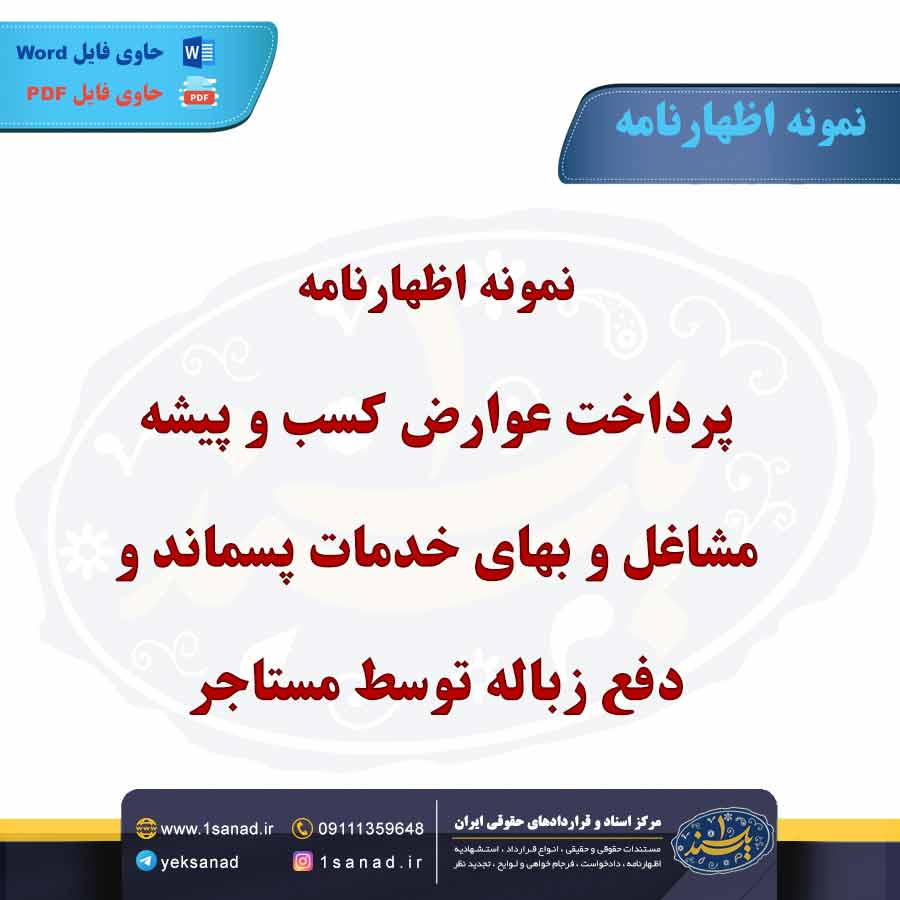 اظهارنامه پرداخت عوارض کسب و پیشه یک مستند رسمی است که توسط صاحبان مشاغل به سازمانهای شهرداری یا مراجع مربوطه ارائه میشود. این اظهارنامه شامل اطلاعات مربوط به نوع کسب و کار، محل استقرار آن، میزان درآمد و سایر جزئیات مالی است که مبنای محاسبه عوارض قرار میگیرد. صاحبان مشاغل باید این اظهارنامه را بهطور سالانه و معمولاً تا پایان سال مالی تسلیم کنند. پس از بررسی این اطلاعات، شهرداری عوارض مورد نظر را محاسبه کرده و مبلغ قابل پرداخت را تعیین میکند. عدم ارائه یا پرداخت به موقع عوارض ممکن است منجر به جریمه و عواقب قانونی برای صاحبان کسب و کار شود. هدف اصلی این عوارض تأمین منابع مالی شهرداریها برای توسعه زیرساختها و خدمات عمومی است.هم اینک می توانید این سند دادخواست را جهت تنظیم موضوع مدنظر خود در قالب فایل Word و PDF پس از پرداخت آنلاین به صورت آنی دانلود نمایید.