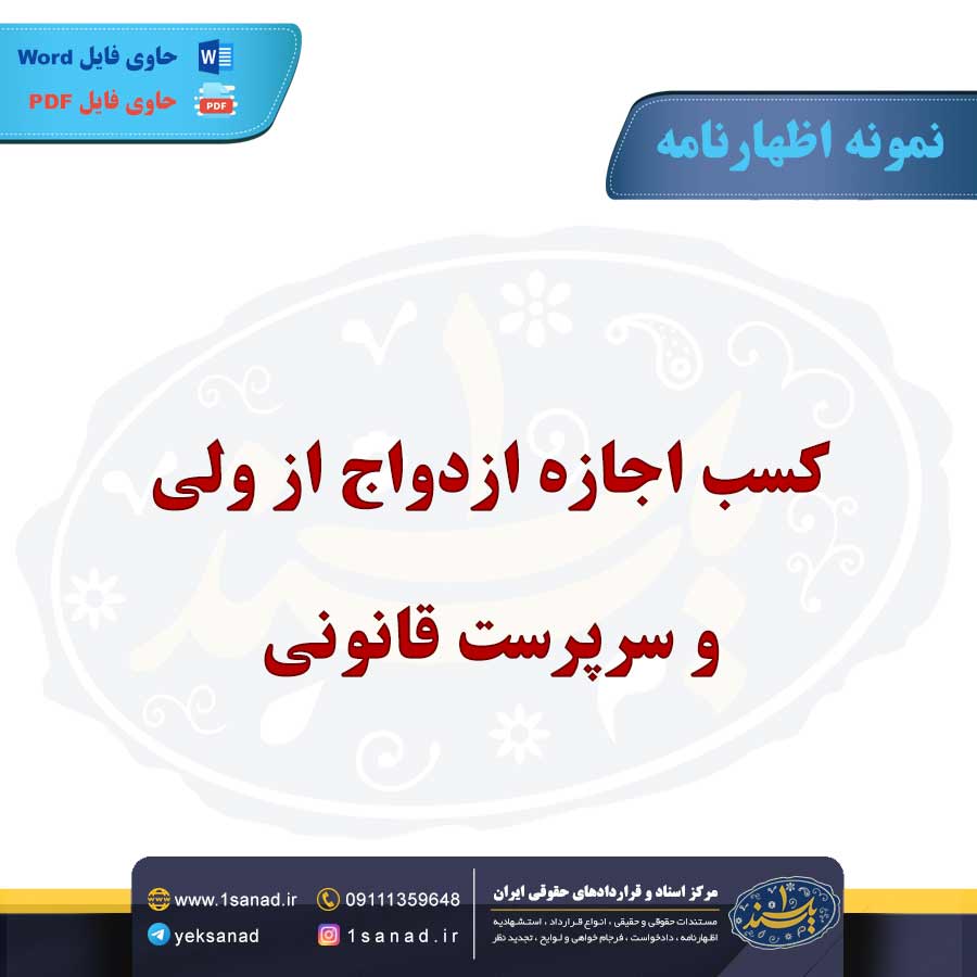 فلذا این سند برای کسب اجازه ازدواج از ولی و سرپرست قانونی توسط اظهار کننده تهیه و هم اینک این اظهارنامه آماده و به صورت اختصاصی پس از پرداخت وجه آن به صورت آنلاین در جامع ترین پایگاه نمونه اظهار نامه ها، آماده و در اختیار شما بوده و قابل دانلود می باشد.
