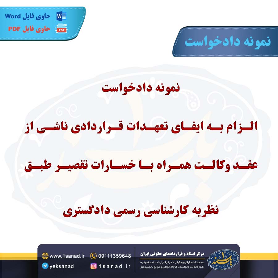 نمونه دادخواست الزام تعهدات قراردادی ناشی از عقد وکالت همراه با خسارات این دادخواست زمانی مطرح می شود که وکیل به تعهدات خود طبق قرارداد وکالت عمل نکرده و موکل از دادگاه درخواست الزام وی به انجام تعهدات را دارد.در این دادخواست،علاوه بر اجرای مفاد قرارداد وکالت،مطالبه خسارات ناشی از عدم انجام یا تاخیر در اجرای تعهدات نیز مطرح می شود.خواهان باید مدارک و قرارداد وکالت را به دادگاه ارائه داده و مستندات خسارات وارده را اثبات کند.درنهایت،با استناد به قوانین مدنی و وکالت،از دادگاه تقاضای صدور حکم بر الزام وکیل به ایفای تعهدات و جبران خسارات را دارد.