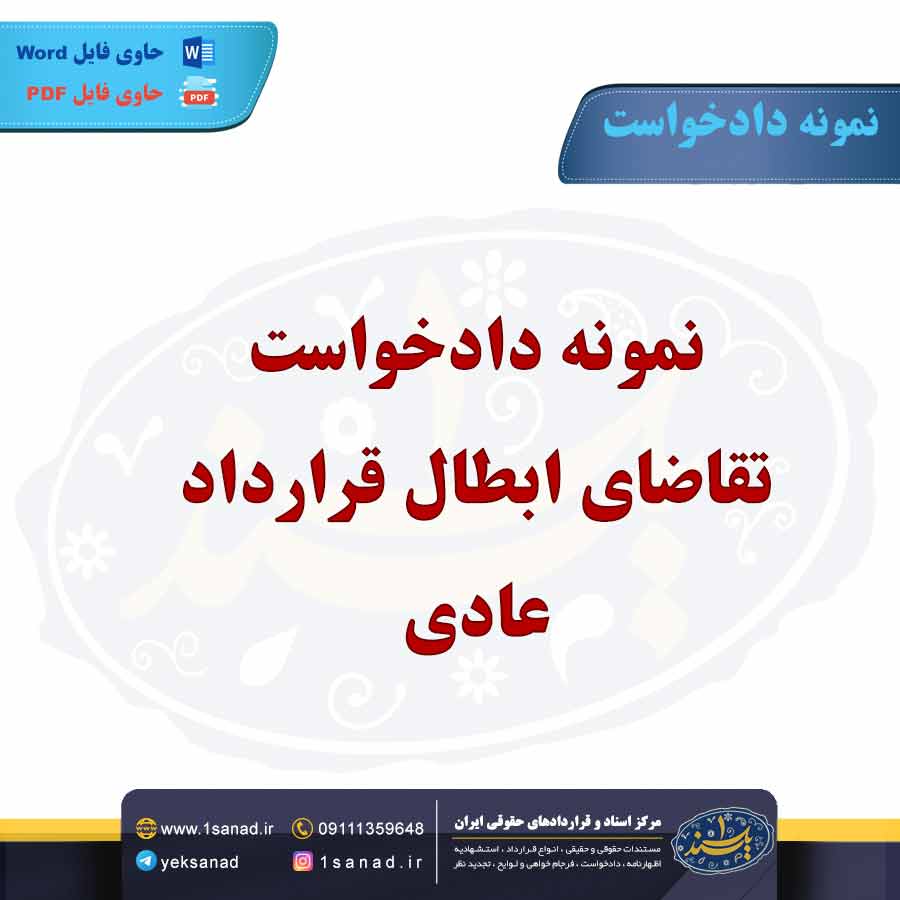 نمونه دادخواست تقاضای ابطال قرارداد عادی؛سندی است که فردی (خواهان)برای درخواست ابطال یک قرارداد غیررسمی(عادی) به دادگاه ارائه می دهد.این دادخواست معمولا شامل مشخصات طرفین،توضیح قرارداد مورد نظر،دلایل ابطال(مانند فقدان قصد و رضا)،اکراه،اشتباه،تدلیس یا عدم رعایت شرایط قانونی)،استنادات حقوقی و خواسته اصلی(ابطال قرارداد)است.همچنین،خواهان باید مدارک و شواهد خود را ضمیمه کند.دادگاه پس از بررسی مستندات و شنیدن دفاعیات خوانده،درباره صحت ادعای خواهان تصمیم گیری می کند.اگر دلایل کافی باشد،حکم ابطال قرارداد صادر می شود.