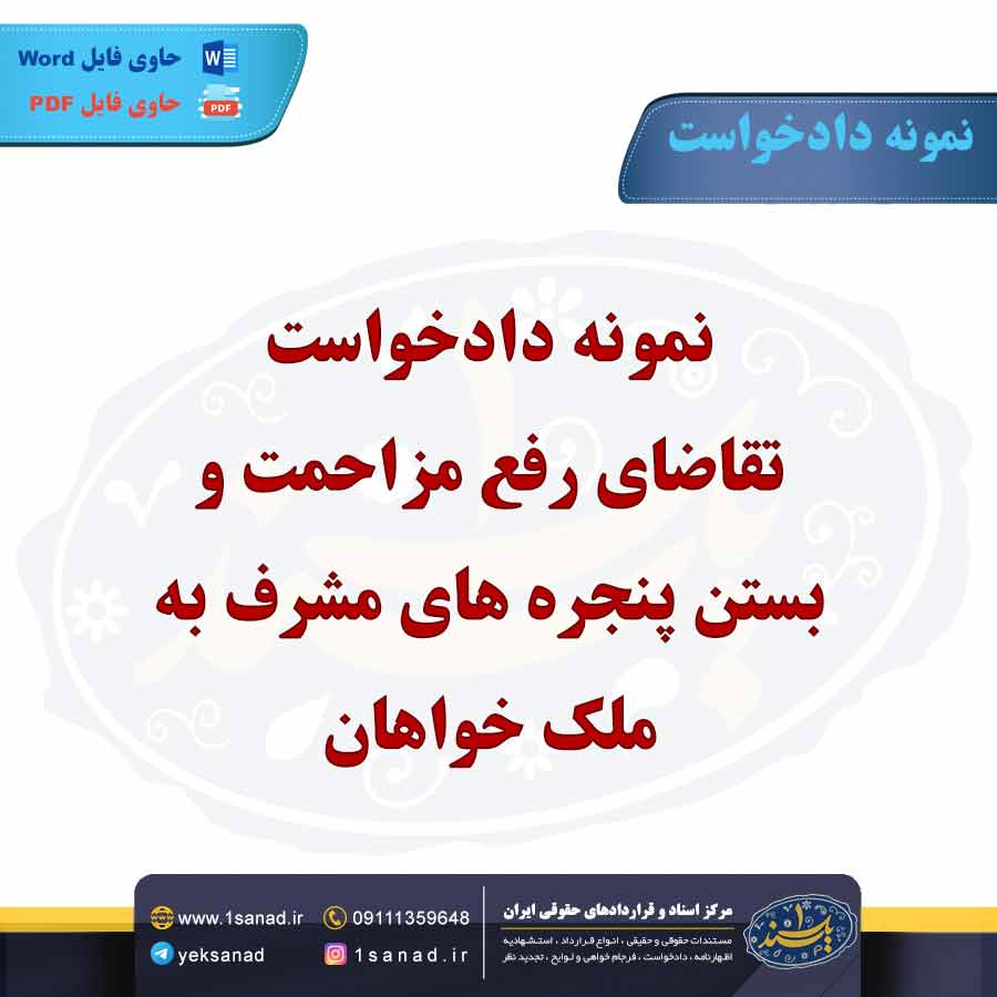 دادخواست تقاضای رفع مزاحمت و بستن پنجره، درخواست مالک یا ساکن یک ملک از دادگاه برای جلوگیری از مزاحمتهای ناشی از تصرفات غیرقانونی همسایه یا دیگران است. این درخواست معمولاً در مواردی مطرح میشود که باز شدن پنجره یا فعالیتهای همسایه موجب ایجاد مشکلاتی مانند ورود سر و صدا، دید غیرمجاز، یا آسیب به حریم خصوصی میشود. در این دادخواست، دلایل و شواهدی از قبیل نقض حقوق مالکیت، مزاحمتهای مکرر و مستندات مربوط به شرایط موجود ارائه میشود. هدف از صدور حکم، حفاظت از حقوق مالک و جلوگیری از مزاحمتهای غیرمجاز است. دادگاه پس از بررسی مستندات و دلایل ارائه شده، میتواند حکمی مبنی بر رفع مزاحمت یا بستن پنجره صادر کند. این نوع دادخواست به عنوان ابزاری برای حفظ آرامش و امنیت ساکنان ملک به کار میرود و میتواند به حفظ روابط همسایگی سالم کمک کند.هم اینک می توانید این سند دادخواست را جهت تنظیم موضوع مدنظر خود در قالب فایل Word و PDF پس از پرداخت آنلاین به صورت آنی دانلود نمایید.