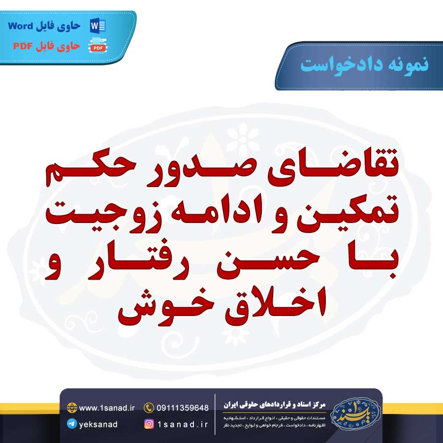 نمونه تقاضای صدور حکم تمکین و ادامه زوجیت با حسن رفتار و اخلاق خوش؛ بنا به داد خواست موکله که طی چند ماهی از زندگی مشترک با خوانده ، بدون دلیل و عذر موجهی به عناوین مختلف وی را مورد آزار و اذیت قرار داده و از تمکین خودداری می نماید و منزل مشترک را ترک کرده ،اجازه دخالت به بستگان و خانواده خودش داده است ؛ که مستقیما در زندگی مشترک دخالت کنند.