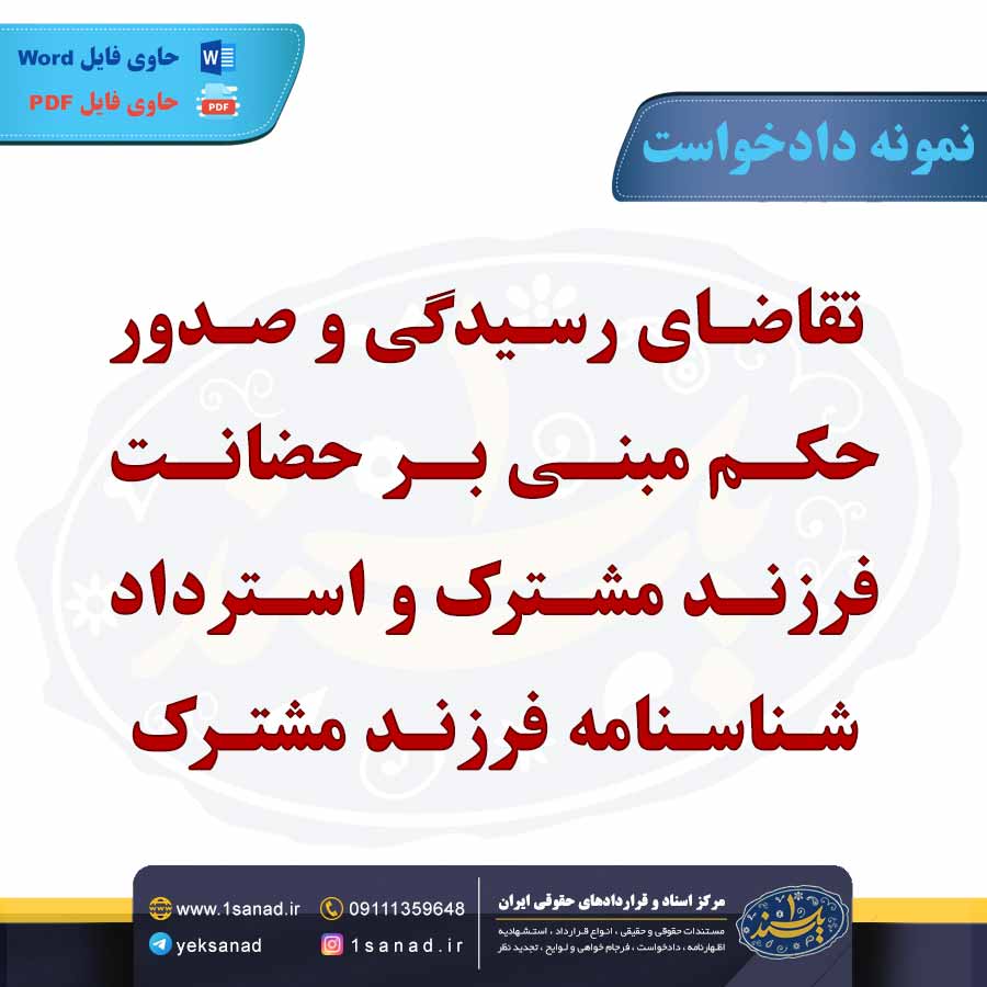 نمونه دادخواست تقاضای رسیدگی و صدور حکم مبنی بر حضانت فرزند مشترک و استرداد شناسنامه فرزند مشترک بنا به دادخواست خواهان، زندگی مشترک بین زوجین بعد از ازدواج رسمی و قانونی ، اختلافات بین زوجین و امکان عدم سازش منجر به طلاق شد ؛ زوجه بعد از ازدواج دوره بارداری را در خانه مادر خود گذرانده و خوانده هیچ گونه اقدامی در تهیه مسکن مشترک ننموده است ، بنا به دادخواست موکله تقاضای رسیدگی و صدور حکم مبنی بر حضانت فرزند مشترک تا سن رشد را تقاضا دارد.