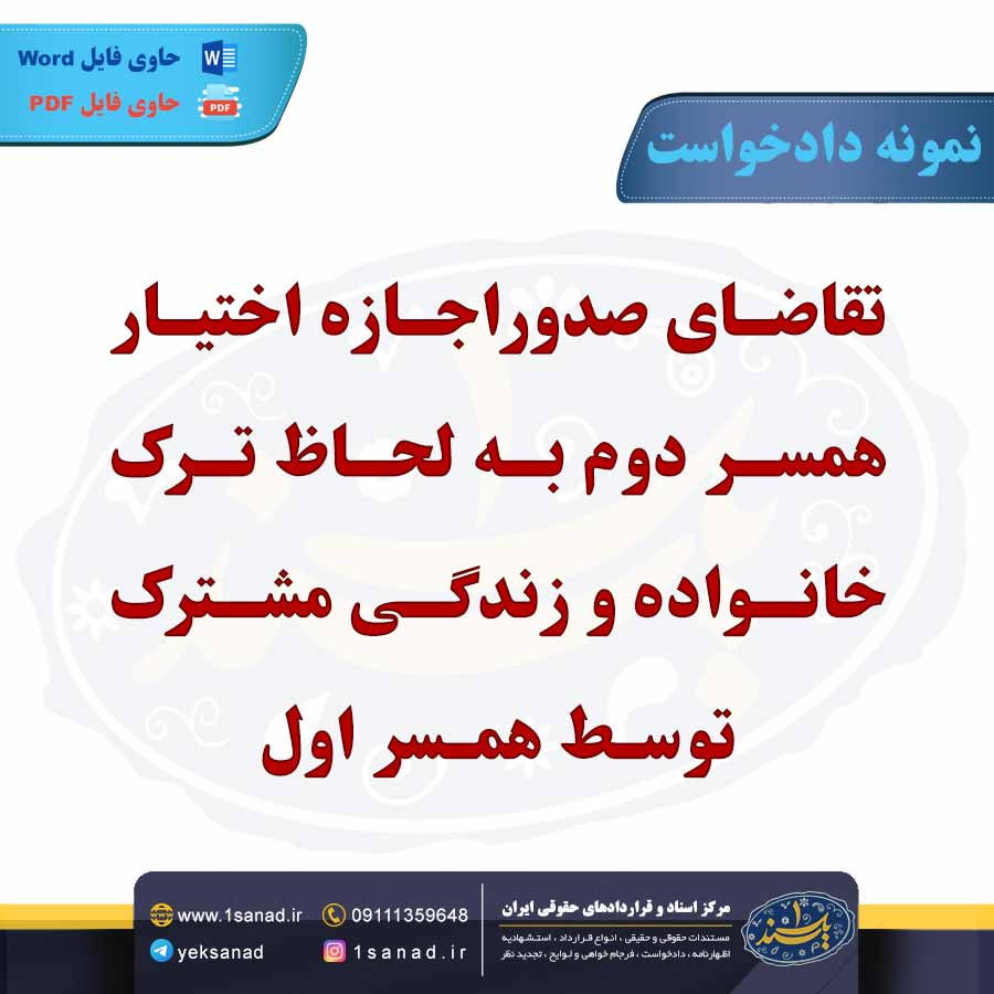 در دادخواست تقاضای صدور اجازه اختیار همسر دوم، خواهان از دادگاه درخواست میکند تا با توجه به شرایط خاص، اجازه ازدواج مجدد صادر شود. معمولاً این درخواست زمانی مطرح میشود که همسر اول به وظایف خود در زندگی زناشویی عمل نکند، دچار بیماری خاص باشد یا نتواند نیازهای خانوادگی را تأمین کند. در این دادخواست، دلایل و مستندات مرتبط با وضعیت فعلی همسر اول و نیاز به ازدواج مجدد ارائه میشود. دادگاه پس از بررسی دلایل و مدارک، با در نظر گرفتن قوانین و شواهد، تصمیمگیری میکند.هم اینک می توانید این سند دادخواست را جهت تنظیم موضوع مدنظر خود در قالب فایل Word و PDF پس از پرداخت آنلاین به صورت آنی دانلود نمایید.