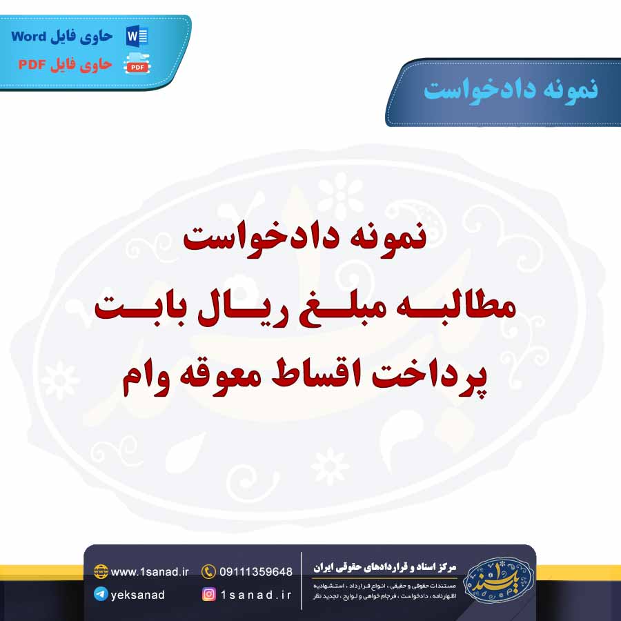 دادخواست مطالبه مبلغ ریال بابت پرداخت اقساط معوقه وام، درخواستی است که از سوی بانک یا مؤسسه مالی به دادگاه ارسال میشود تا طلب خود را از وامگیرنده بابت اقساط معوقه دریافت کند. این دادخواست زمانی تنظیم میشود که وامگیرنده از پرداخت اقساط وام در موعد مقرر خودداری کرده یا نتوانسته مبلغ مورد نظر را بهموقع پرداخت کند. بانک یا مؤسسه مالی در این دادخواست، مبلغ بدهی معوقه و جزئیات مربوط به قرارداد وام را ذکر کرده و از دادگاه درخواست میکند تا مبلغ معوقه را از وامگیرنده دریافت کند. دادگاه پس از بررسی، ممکن است حکم به پرداخت بدهی و هزینههای اضافی صادر کند. هدف از این دادخواست، وصول مطالبات معوقه و جلوگیری از خسارت بیشتر است.هم اینک می توانید این سند دادخواست را جهت تنظیم موضوع مدنظر خود در قالب فایل Word و PDF پس از پرداخت آنلاین به صورت آنی دانلود نمایید.