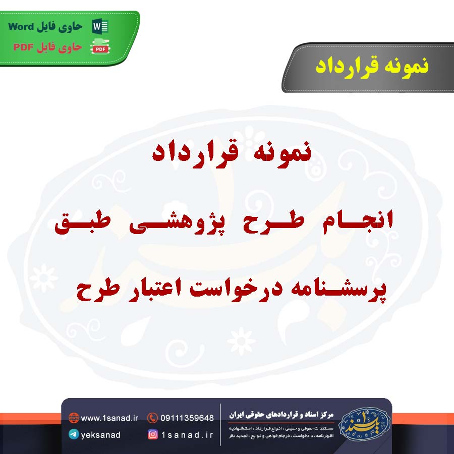 نمونه قرارداد انجام طرح پژوهشی طبق پرسشنامه درخواست اعتبار طرح ؛نمونه قرارداد انجام طرح پژوهشی طبق پرسشنامه درخواست اعتبار طرح، قراردادی است که بین مؤسسه پژوهشی یا محقق و نهاد تأمینکننده اعتبار (مانند دانشگاه یا وزارتخانه) تنظیم میشود. این قرارداد شامل جزئیات پروژه پژوهشی، اهداف تحقیق، زمانبندی، منابع مالی و الزامات اجرایی طرح است. در این قرارداد، مبلغ اعتبار طرح و نحوه پرداخت آن، شرایط گزارشدهی و نظارت بر پیشرفت طرح نیز مشخص میشود. همچنین، تعهدات طرفین در قبال انجام پژوهش و رعایت قوانین و مقررات پژوهشی درج میگردد. این قرارداد بهعنوان مستند قانونی برای تأمین مالی و مدیریت طرح پژوهشی استفاده میشود.هم اینک می توانید این سند دادخواست را جهت تنظیم موضوع مدنظر خود در قالب فایل Word و PDF پس از پرداخت آنلاین به صورت آنی دانلود نمایید.