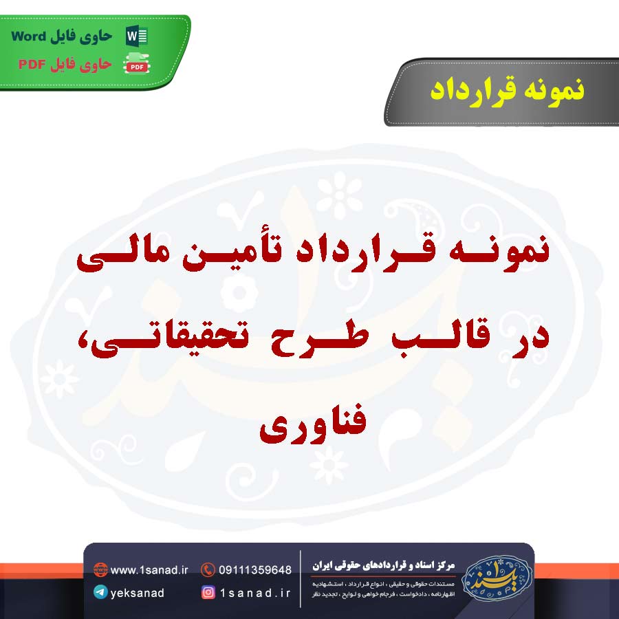 نمونه قرارداد تأمین مالی در قالب طرح تحقیقاتی، فناوری ؛نمونه قرارداد تأمین مالی در قالب طرح تحقیقاتی، فناوری توافقنامهای است که بین یک پژوهشگر، تیم تحقیقاتی یا دانشگاه و یک نهاد مالی (مثل دولت یا شرکتهای خصوصی) منعقد میشود. این قرارداد بهمنظور تأمین منابع مالی برای انجام یک پروژه تحقیقاتی یا توسعه فناوری مشخص، تنظیم میگردد. قرارداد معمولاً شامل جزئیات بودجه، نحوه تخصیص منابع، اهداف تحقیقاتی، زمانبندی پروژه و شرایط استفاده از نتایج تحقیق است. همچنین، حقوق مالکیت معنوی، نحوه گزارشدهی و مسئولیتهای طرفین نیز در این قرارداد مشخص میشود.هم اینک می توانید این سند دادخواست را جهت تنظیم موضوع مدنظر خود در قالب فایل Word و PDF پس از پرداخت آنلاین به صورت آنی دانلود نمایید.
