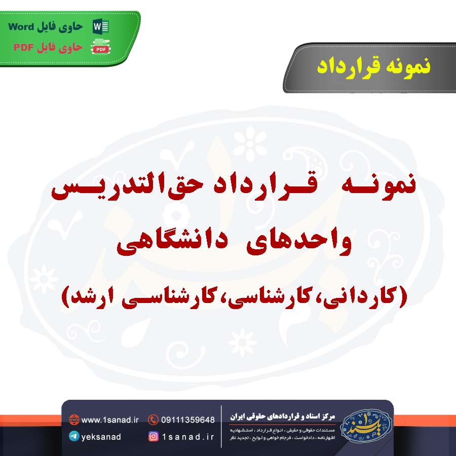 نمونه قرارداد حقالتدریس واحدهای دانشگاهی یا قرارداد حقالتدریس واحدهای دانشگاهی(کاردانی، کارشناسی، کارشناسی ارشد)؛قرارداد حقالتدریس واحدهای دانشگاهی معمولاً بین استاد و دانشگاه برای تدریس در مقاطع مختلف (کاردانی، کارشناسی، کارشناسی ارشد) منعقد میشود. این قرارداد شامل جزئیات مربوط به تعداد واحدهای تدریس، مبلغ پرداختی به استاد، زمانبندی کلاسها، وظایف استاد، و مدت زمان قرارداد است. پرداخت حقالتدریس معمولاً بر اساس تعداد واحدهای تدریسشده یا تعداد ساعتهای تدریس میباشد. استادان معمولاً به عنوان پیمانکار مستقل شناخته میشوند و برای هر ترم یا سال تحصیلی قرارداد جدیدی تنظیم میشود. این قرارداد میتواند مشروط به ارزیابی عملکرد استاد و رعایت ضوابط دانشگاه باشد.هم اینک می توانید این سند دادخواست را جهت تنظیم موضوع مدنظر خود در قالب فایل Word و PDF پس از پرداخت آنلاین به صورت آنی دانلود نمایید.
