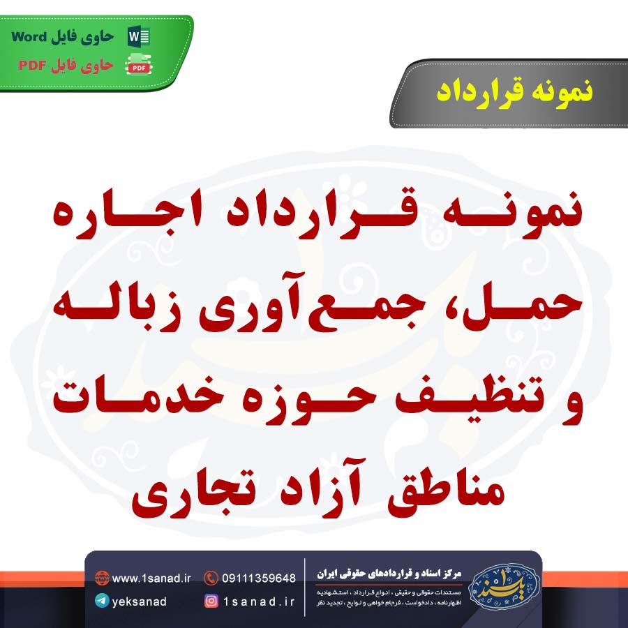 نمونه قرارداد اجاره حمل، جمعآوری زباله و تنظیف حوزه خدمات مناطق آزاد تجاری؛نمونه قرارداد اجاره حمل و جمعآوری زباله در مناطق آزاد تجاری به توافقی میان پیمانکار و اداره منطقه آزاد اشاره دارد که در آن پیمانکار موظف به ارائه خدمات جمعآوری، حمل و دفع زباله در محدوده معین است. این قرارداد معمولاً شامل مشخصات خدمات، مدت زمان قرارداد، میزان هزینهها، شرایط نگهداری و بهرهبرداری از تجهیزات، و نحوه پرداخت است. همچنین، رعایت استانداردهای زیستمحیطی و بهداشتی نیز از الزامات آن به شمار میرود. طرفین قرارداد موظف به جبران خسارات ناشی از عدم اجرای دقیق تعهدات خود هستند. در این قرارداد، ضمانت اجرایی برای تضمین اجرای تعهدات معمولاً در نظر گرفته میشود.هم اینک می توانید این سند دادخواست را جهت تنظیم موضوع مدنظر خود در قالب فایل Word و PDF پس از پرداخت آنلاین به صورت آنی دانلود نمایید.