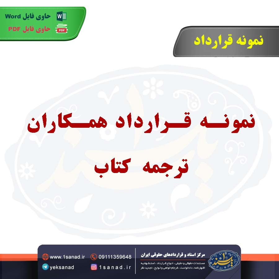 نمونه قرارداد همکاران ترجمه کتاب ؛نمونه قرارداد همکاران ترجمه کتاب یک توافقنامه قانونی است که بین ناشر یا نویسنده و مترجم تنظیم میشود. این قرارداد شامل شرایط ترجمه کتاب، مدت زمان، میزان دستمزد، نحوه پرداخت، حقوق مالکیت معنوی، و شرایط انتشار ترجمه است. همچنین، جزئیات مربوط به مسئولیتهای هر طرف، مانند ویرایش، بازبینی و اصلاحات ترجمه، نیز در آن گنجانده میشود. هدف این قرارداد، ایجاد یک چارچوب روشن برای همکاری و جلوگیری از بروز مشکلات حقوقی احتمالی است.هم اینک می توانید این سند دادخواست را جهت تنظیم موضوع مدنظر خود در قالب فایل Word و PDF پس از پرداخت آنلاین به صورت آنی دانلود نمایید.