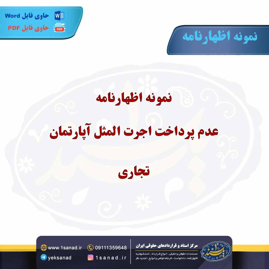 اظهارنامه عدم پرداخت اجرتالمثل آپارتمان تجاری، به سندی اطلاق میشود که توسط مالک یا مستاجر یک واحد تجاری تهیه میشود تا عدم پرداخت اجرتالمثل (اجاره بها) را به طور رسمی اعلام کند. این اظهارنامه معمولاً شامل جزئیات مربوط به قرارداد اجاره، تاریخ شروع و پایان قرارداد، مبلغ اجرتالمثل و دلایل عدم پرداخت میباشد. ارسال این اظهارنامه میتواند به عنوان یک اقدام قانونی برای مطالبه حقوق مالک یا مستاجر مورد استفاده قرار گیرد. همچنین، ممکن است برای آغاز فرایند قانونی مانند اقامه دعوی بر اساس قانون روابط موجر و مستاجر نیز لازم باشد. این سند باید بهطور رسمی و با رعایت الزامات قانونی تنظیم شود تا از اعتبار و قابلیت اجرایی لازم برخوردار باشد.هم اینک می توانید این سند دادخواست را جهت تنظیم موضوع مدنظر خود در قالب فایل Word و PDF پس از پرداخت آنلاین به صورت آنی دانلود نمایید.