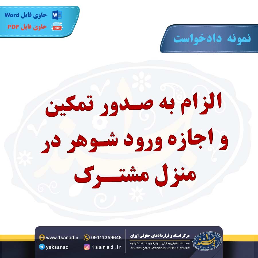 نمونه متن دادخواست الزام به صدور تمکین و اجازه ورود شوهر در منزل مشترک ، موکل خوانده به موجب سند عقد دائمی و رسمی که داشته اند،زندگی مشترک را آغاز کرده و رابطه زناشویی هم بین زوج و زوجه بوجود آمده و فرزند مشترکی هم نداشته ، بنابر توافق بین زوجین قرار بوده که منزل شخصی خوانده بعنوان منزل مشترک باشد و لیکن متاسفانه خوانده بر خلاف توافق انجام شده از ورود موکل به منزل مشترک جلوگیری و تحت هیچ شرایطی حاضر نیست در منزلی که موکل تعیین می نماید زندگی نماید و در طی چند مدت خوانده هیچ تمکینی اعم از عام و خاص را انجام نداده است.