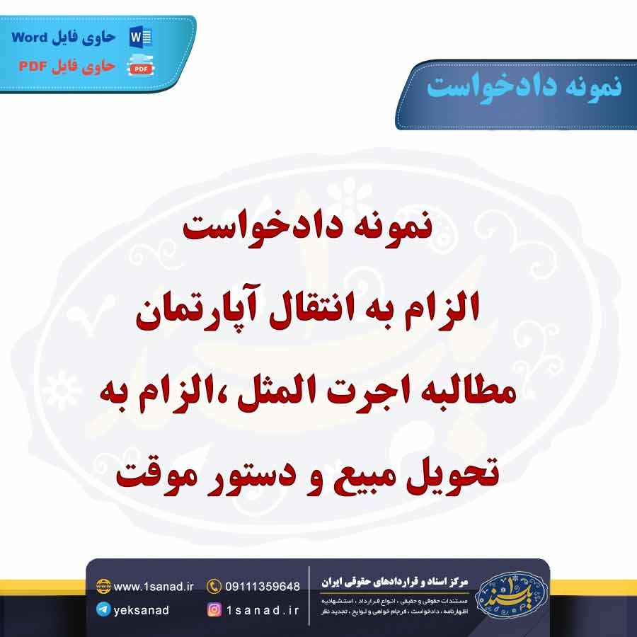 دادخواست الزام به انتقال آپارتمان و مطالبه اجرت المثل، زمانی مطرح میشود که خریدار پس از پرداخت مبلغ قرارداد، فروشنده را ملزم به انتقال ملک (آپارتمان) کند و در عین حال خواستار دریافت اجرت المثل برای مدت زمانی باشد که ملک به او تحویل داده نشده است. در این نوع دادخواست، خریدار باید مدارکی مانند قرارداد فروش، رسیدهای پرداخت و مستندات مربوط به تأخیر در تحویل را ارائه دهد. اجرت المثل به معنای مبلغی است که به عنوان حقالزحمه استفاده از ملک در مدت تأخیر محاسبه میشود. دادگاه پس از بررسی مدارک و شرایط، تصمیم به الزام فروشنده به انتقال آپارتمان و پرداخت اجرت المثل میگیرد. همچنین، خریدار ممکن است خواستار جبران خسارتهای ناشی از تأخیر نیز باشد. این دعوی معمولاً در حوزه حقوق ملکی و قراردادها بررسی میشود.هم اینک می توانید این سند دادخواست را جهت تنظیم موضوع مدنظر خود در قالب فایل Word و PDF پس از پرداخت آنلاین به صورت آنی دانلود نمایید.