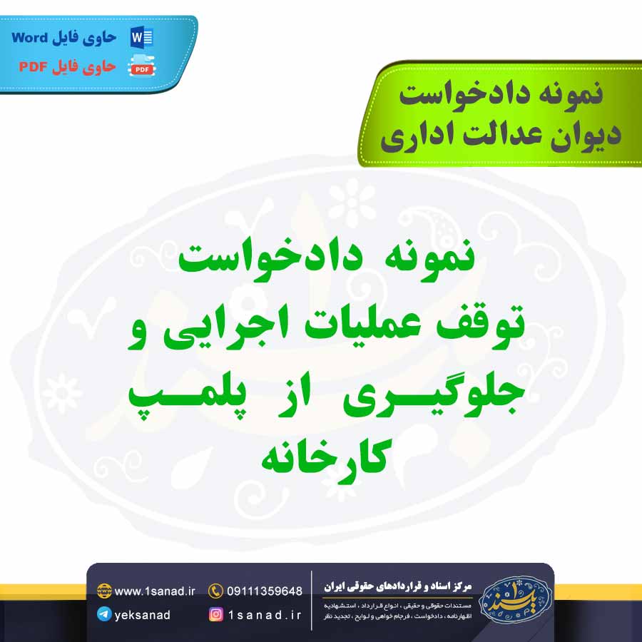 نمونه دادخواست توقف عملیات اجرایی و جلوگیری از پلمپ کارخانه؛ به جهت اختلاف بین طرفین قرارداد مین سازنده و سفارش دهنده اقلام صنعتی تولید شده در کارخانه از حیث تامین و در اختیار قراردادن و همچنین گارانتی ادوات مورد قرارداد که در موارد مشابه شامل خدمات نرم افزاری و یا سخت افزاری در متن دادخواست می باشد و قابل تعمیم و بهره برداری در موارد مشابه جهت استفای حقوق طرفین معامله و قرارداد در دیوان عدالت اداری پس از استماع رای مرضی الطرفین و همچنین دادگاه و قضات محترم در موارد و ترتیب شکایات طرفین مورد هدف می باشد.