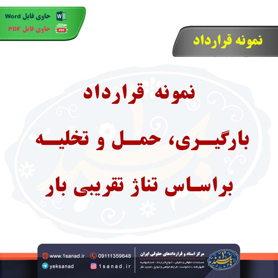 نمونه قرارداد بارگیری حمل و تخلیه براساس تناژ تقریبی بار؛نمونه قرارداد بارگیری، حمل و تخلیه براساس تناژ تقریبی بار معمولاً برای تنظیم شرایط حمل کالاها بین طرفین (مانند صاحب کالا و شرکت حملونقل) بهکار میرود. در این نوع قرارداد، وزن تقریبی بار به عنوان معیار اصلی تعیین هزینهها و زمانبندی انجام خدمات قرار میگیرد. این قرارداد شامل مواردی مانند هزینه حمل بر اساس تناژ، مسئولیتهای طرفین در بارگیری و تخلیه، زمانبندی و شرایط پرداخت است. همچنین، ممکن است بندهایی برای جبران خسارتهای احتمالی و شرایط فورس ماژور نیز گنجانده شود. از آنجا که تناژ بار تقریبی است، معمولاً اصلاحات و تسویه حسابها در صورت تغییر وزن واقعی بار انجام میشود.هم اینک می توانید این سند دادخواست را جهت تنظیم موضوع مدنظر خود در قالب فایل Word و PDF پس از پرداخت آنلاین به صورت آنی دانلود نمایید.
