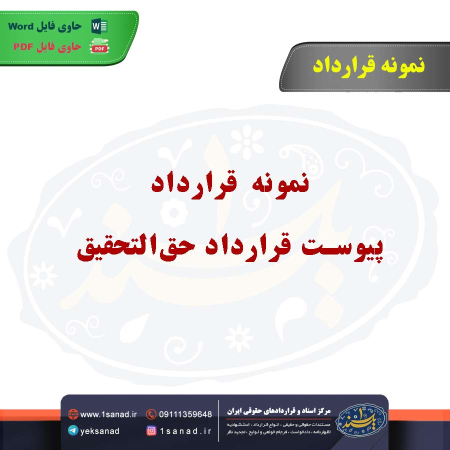 نمونه قرارداد پیوست قرارداد حقالتحقیق؛نمونه قرارداد پیوست قرارداد حقالتحقیق، سندی تکمیلی است که به قرارداد اصلی حقالتحقیق افزوده میشود و جزئیات بیشتری از موضوع همکاری را مشخص میکند. این پیوست میتواند شامل برنامه زمانبندی، شرح دقیق وظایف، نحوه دسترسی به منابع یا دادهها و شرایط حفظ محرمانگی باشد. هدف از این پیوست، شفافسازی تعهدات طرفین و جلوگیری از سوءتفاهم است. معمولا بهصورت مکتوب تهیه شده و به امضای طرفین میرسد. اعتبار حقوقی آن وابسته به هماهنگی با مفاد قرارداد اصلی است.هم اینک می توانید این سند دادخواست را جهت تنظیم موضوع مدنظر خود در قالب فایل Word و PDF پس از پرداخت آنلاین به صورت آنی دانلود نمایید.